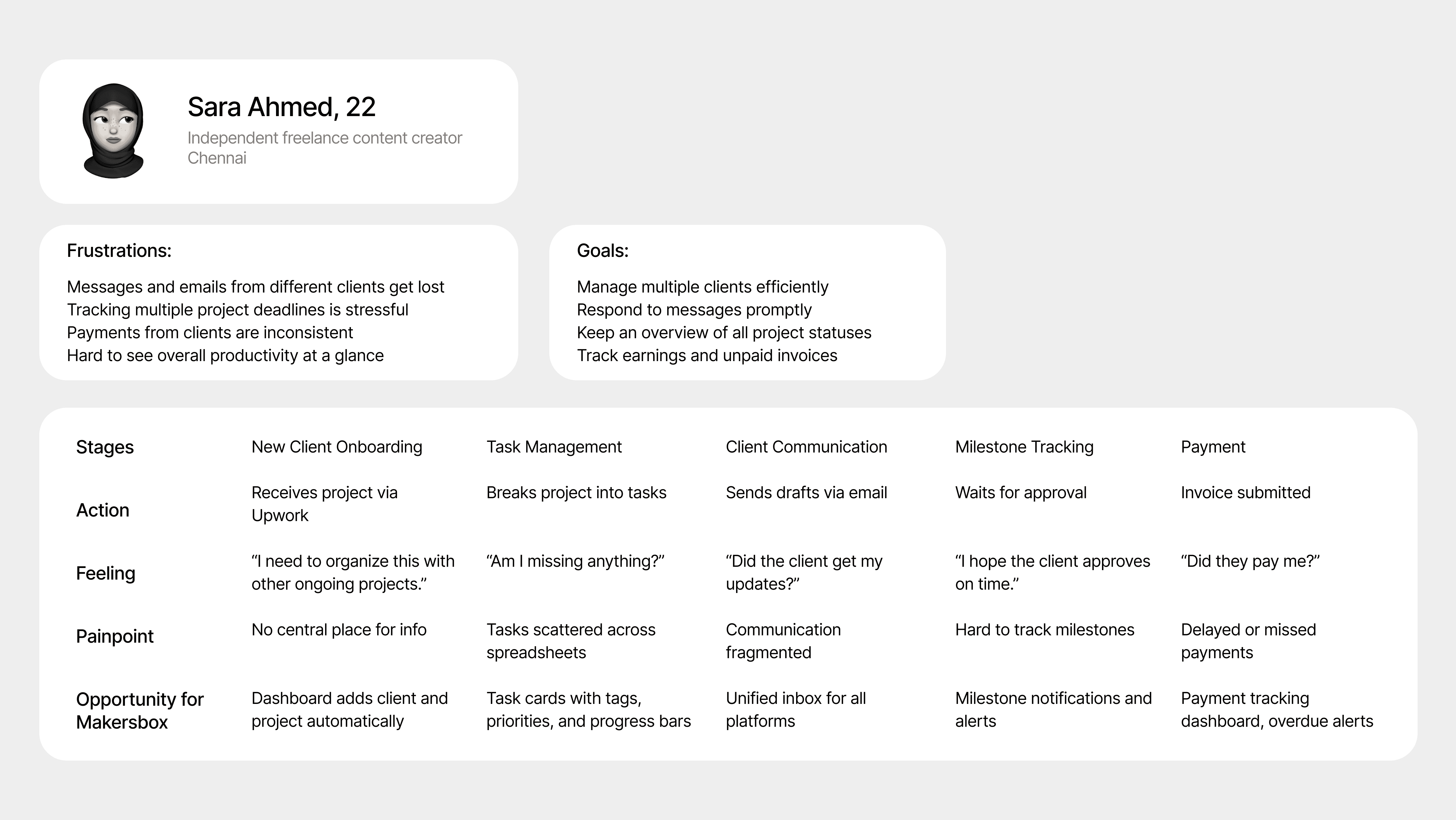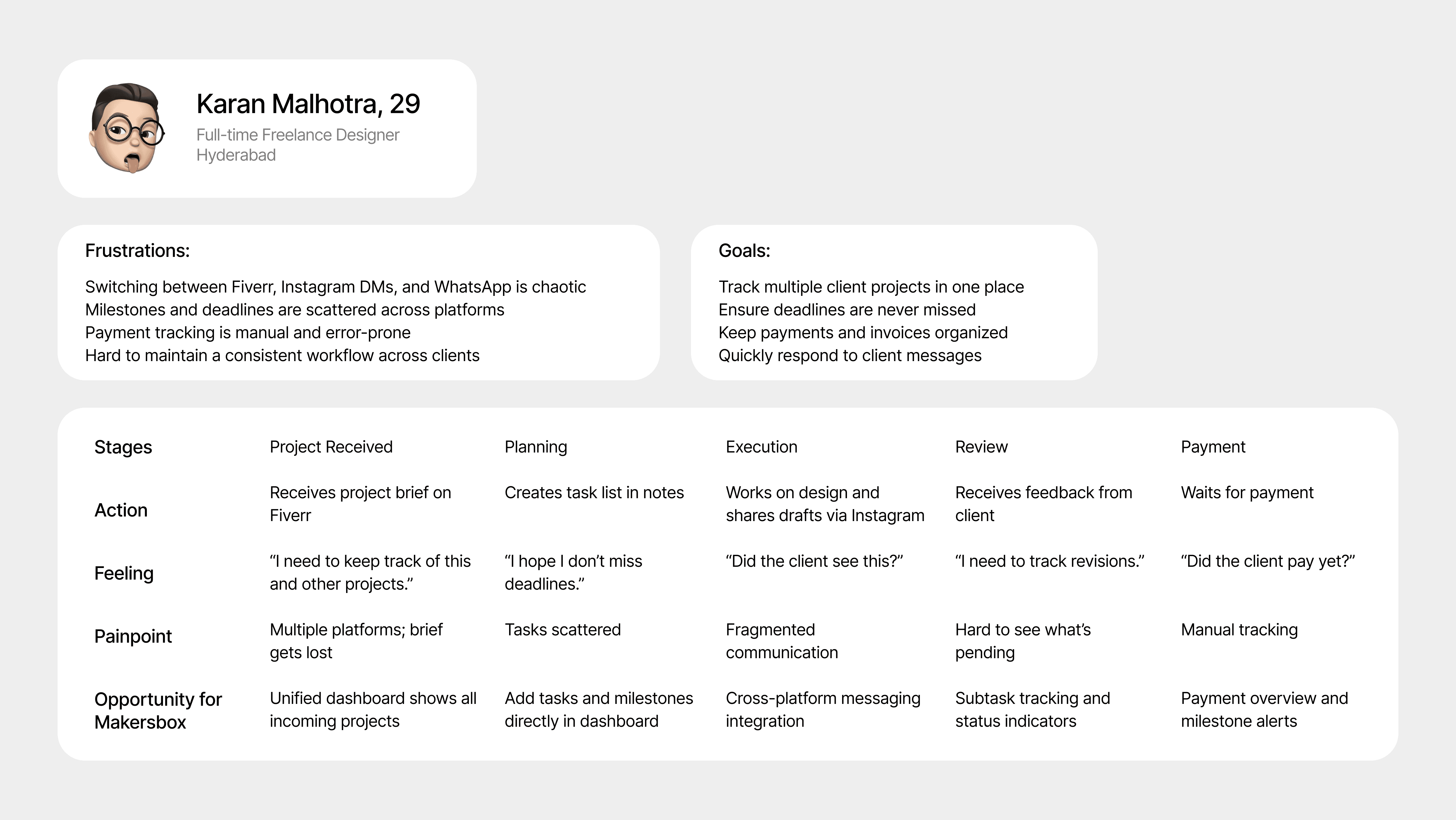 These questions guided the identification of core features such as a unified dashboard, cross-platform messaging, milestone tracking, and payment management — which formed the foundation of MakersBox.