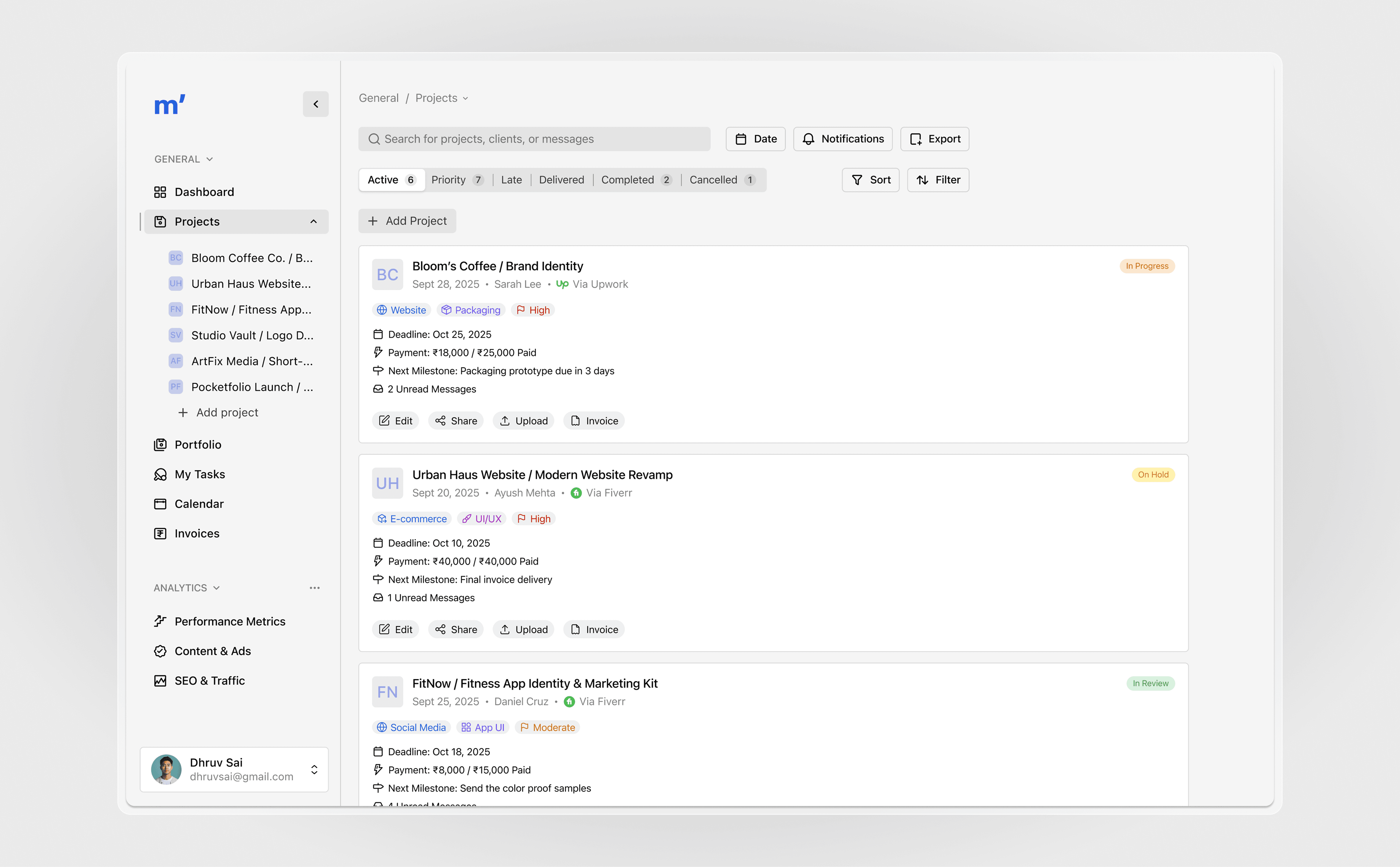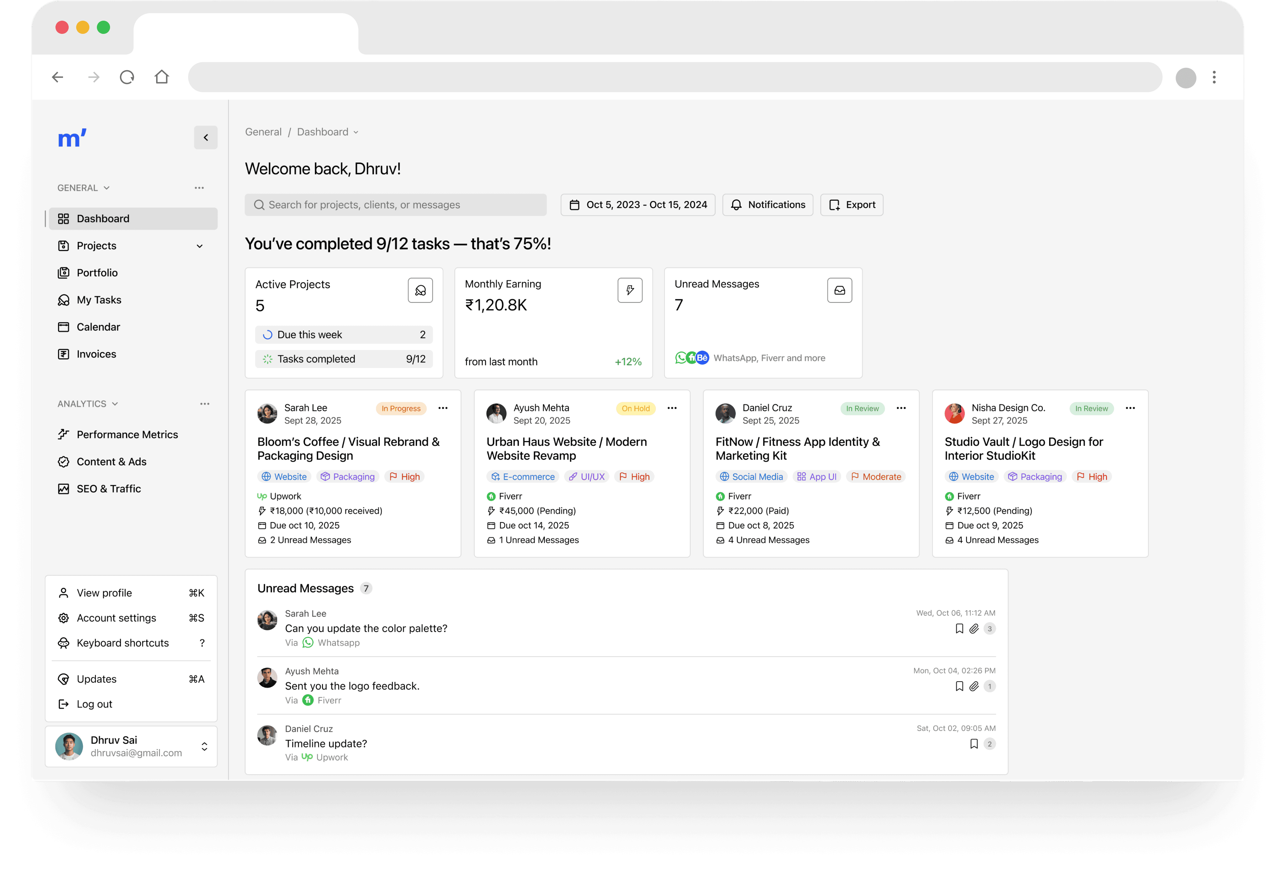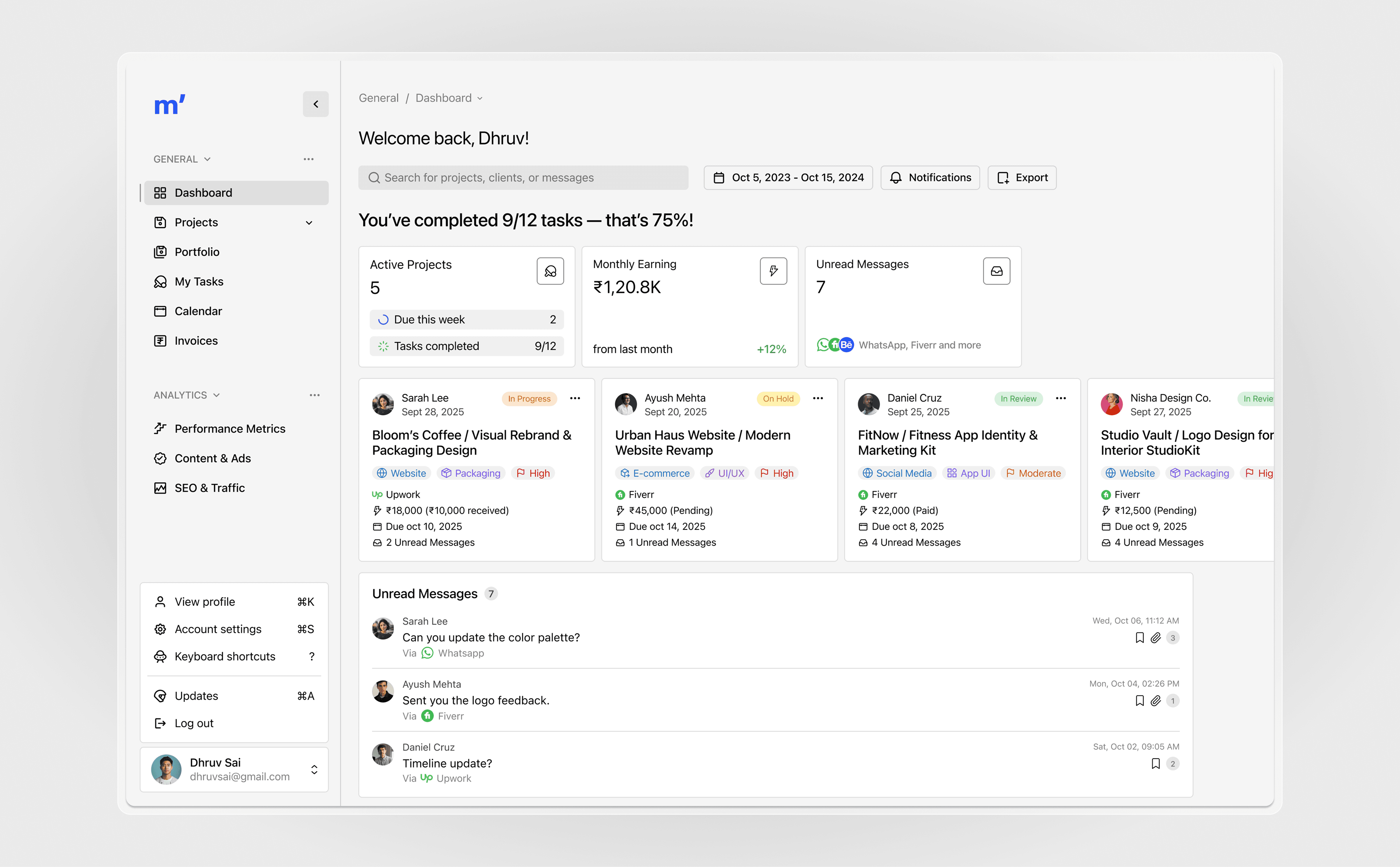 Users get a complete overview of their freelance business — project statuses, upcoming deadlines, payments, and unread messages — all in one glance.