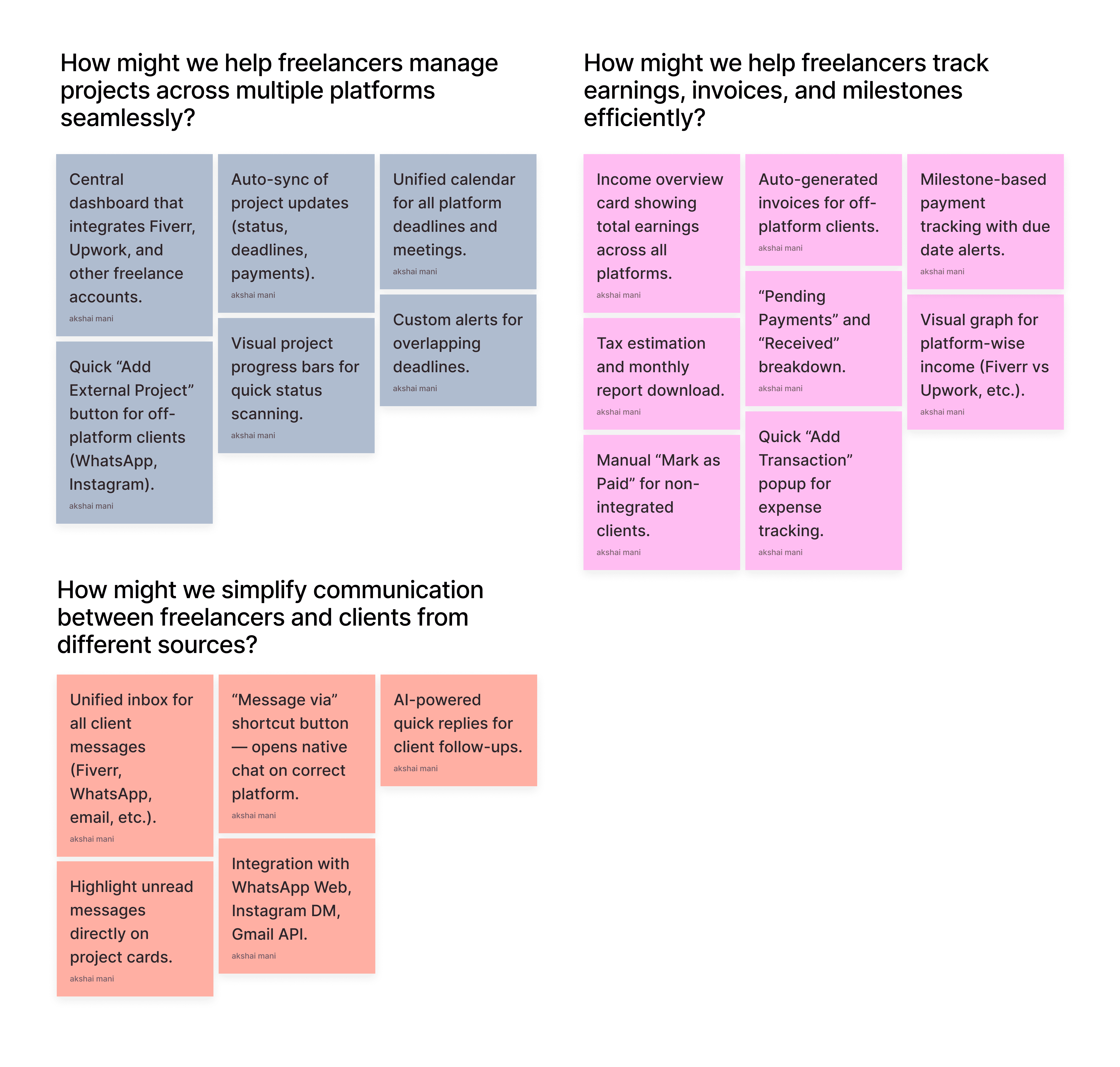 To understand how freelancers currently manage projects across multiple platforms and the challenges they face, I conducted user interviews with 8 participants (4 who actively use freelance platforms like Fiverr or Upwork, and 4 who primarily work with direct clients through social media or referrals). Additionally, I collected quantitative insights through surveys answered by 60 freelancers from online freelance and creative communities to identify common workflow pain points, tool usage patterns, and platform frustrations.